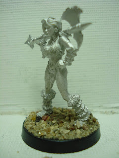 I pledged at the 'Bakers Dozen' level which gave me thirteen models to choose. Most of the miniatures produced came in three versions. These were a fully armoured and/or clothed 'Winter' version, a slightly less covered up version in a more fantasy 'Pin-Up' style and a 'Skyclad' version...basically a naked version you could use as an armature to armour, dress or equip as your own modelling skills allowed. I selected the 'Pin-Up' version for the most part as these were closest to the Matt Dixon art and I just liked them. The models were available in both metal and resin but finances prohibited me from paying the extra for resin. The models are of the 30mm Scale but vary slightly in height based on the build of the model in question and of course the pose. They're based on the standard base they came with and a bit of sand...fancier basing will occur if and when they find their way into other of my game systems...